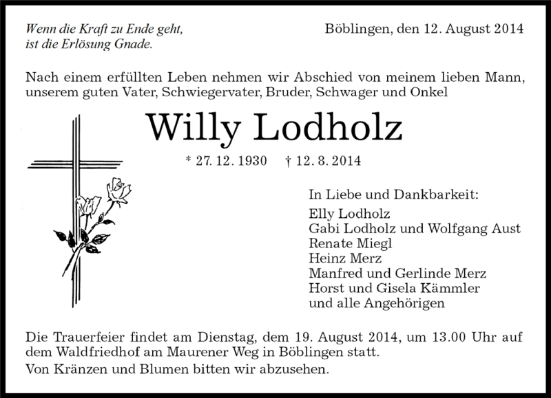 Hier finden Sie alle Traueranzeigen aus der Zeitung, die bisher für Willy Lodholz erschienen sind. Weitere Traueranzeigen, die in der Zeitung erscheinen, werden hier ebenfalls aufgelistet