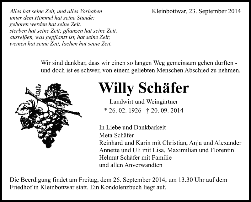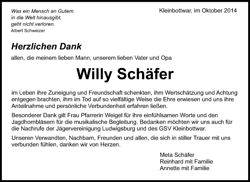 Hier finden Sie alle Traueranzeigen aus der Zeitung, die bisher für Willy Schäfer erschienen sind. Weitere Traueranzeigen, die in der Zeitung erscheinen, werden hier ebenfalls aufgelistet