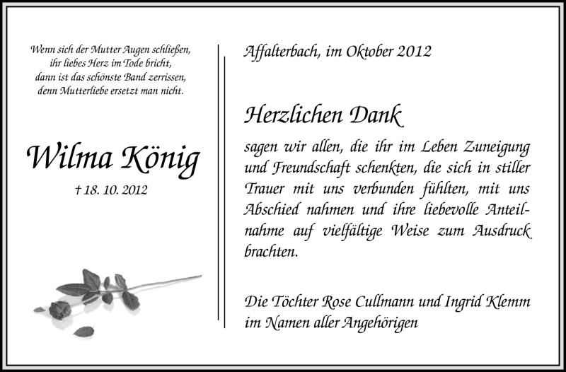 Hier finden Sie alle Traueranzeigen aus der Zeitung, die bisher für Wilma König erschienen sind. Weitere Traueranzeigen, die in der Zeitung erscheinen, werden hier ebenfalls aufgelistet