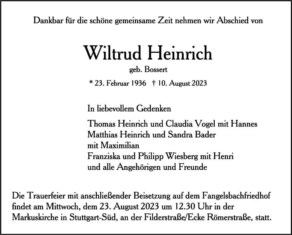 Hier finden Sie alle Traueranzeigen aus der Zeitung, die bisher für Wiltrud Heinrich erschienen sind. Weitere Traueranzeigen, die in der Zeitung erscheinen, werden hier ebenfalls aufgelistet