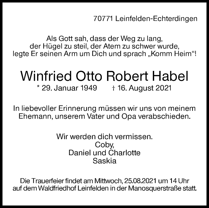 Hier finden Sie alle Traueranzeigen aus der Zeitung, die bisher für Winfried Otto Robert Habel erschienen sind. Weitere Traueranzeigen, die in der Zeitung erscheinen, werden hier ebenfalls aufgelistet