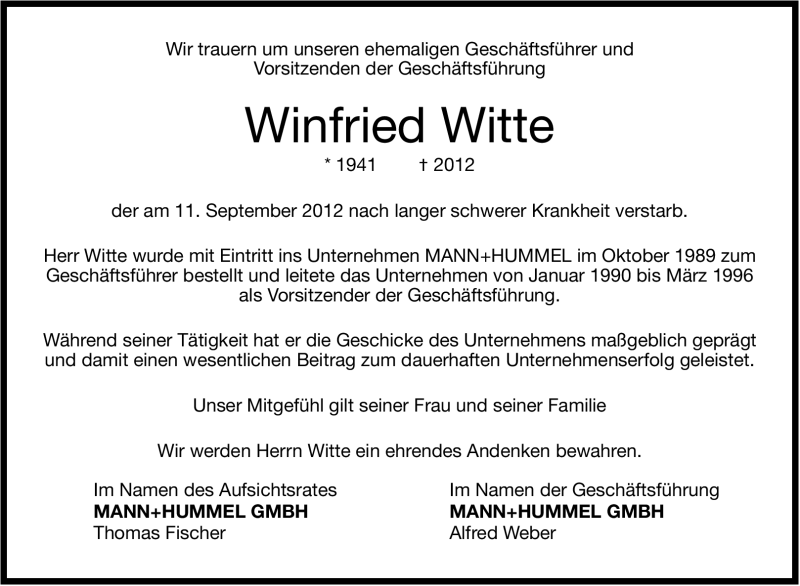 Hier finden Sie alle Traueranzeigen aus der Zeitung, die bisher für Winfried Witte erschienen sind. Weitere Traueranzeigen, die in der Zeitung erscheinen, werden hier ebenfalls aufgelistet