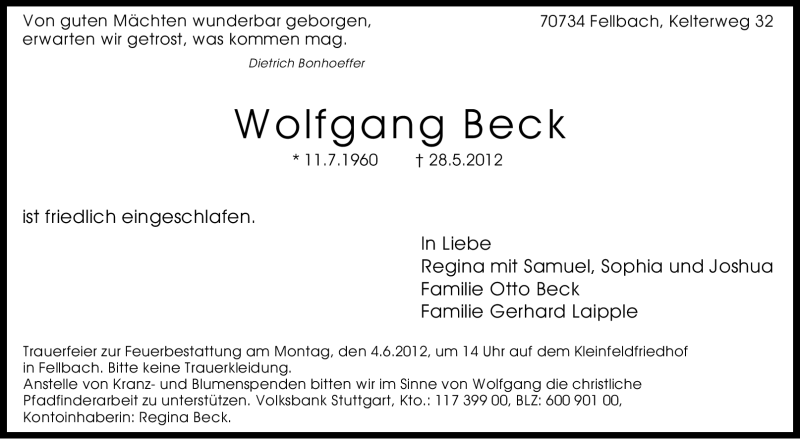 Hier finden Sie alle Traueranzeigen aus der Zeitung, die bisher für Wolfgang Beck erschienen sind. Weitere Traueranzeigen, die in der Zeitung erscheinen, werden hier ebenfalls aufgelistet