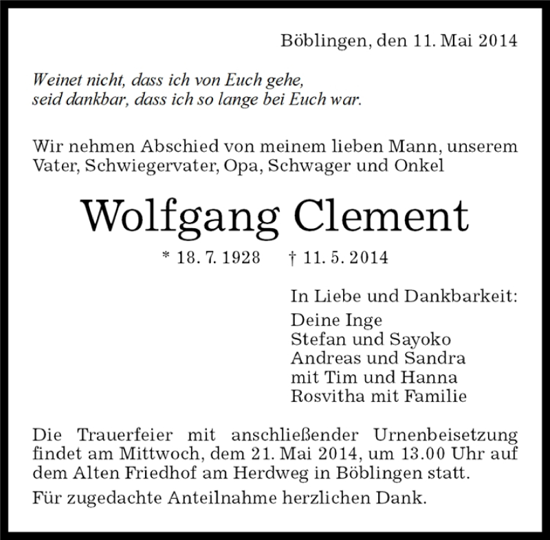 Hier finden Sie alle Traueranzeigen aus der Zeitung, die bisher für Wolfgang Clement erschienen sind. Weitere Traueranzeigen, die in der Zeitung erscheinen, werden hier ebenfalls aufgelistet