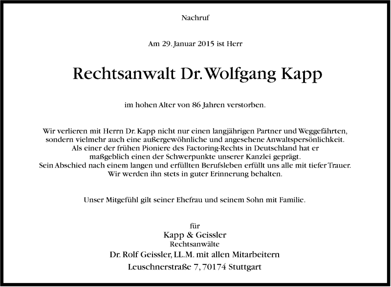 Hier finden Sie alle Traueranzeigen aus der Zeitung, die bisher für Wolfgang Kapp erschienen sind. Weitere Traueranzeigen, die in der Zeitung erscheinen, werden hier ebenfalls aufgelistet