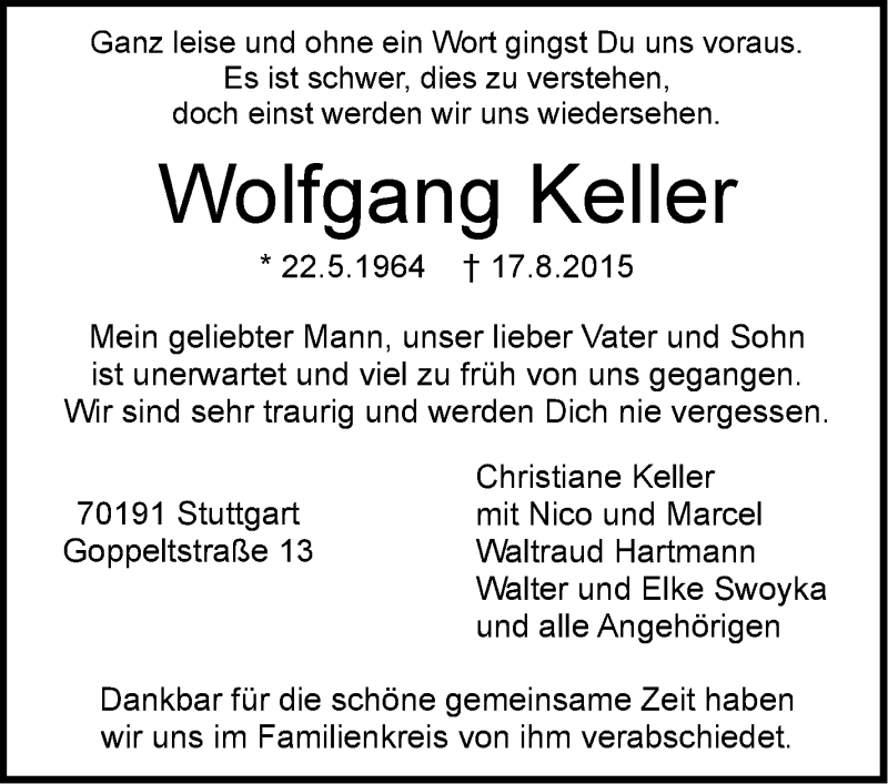 Hier finden Sie alle Traueranzeigen aus der Zeitung, die bisher für Wolfgang Keller erschienen sind. Weitere Traueranzeigen, die in der Zeitung erscheinen, werden hier ebenfalls aufgelistet