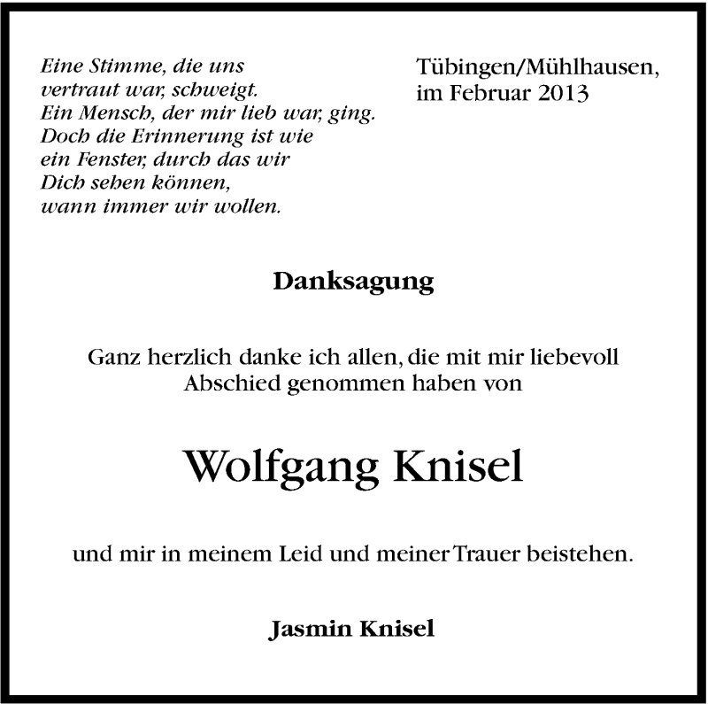 Hier finden Sie alle Traueranzeigen aus der Zeitung, die bisher für Wolfgang Knisel erschienen sind. Weitere Traueranzeigen, die in der Zeitung erscheinen, werden hier ebenfalls aufgelistet