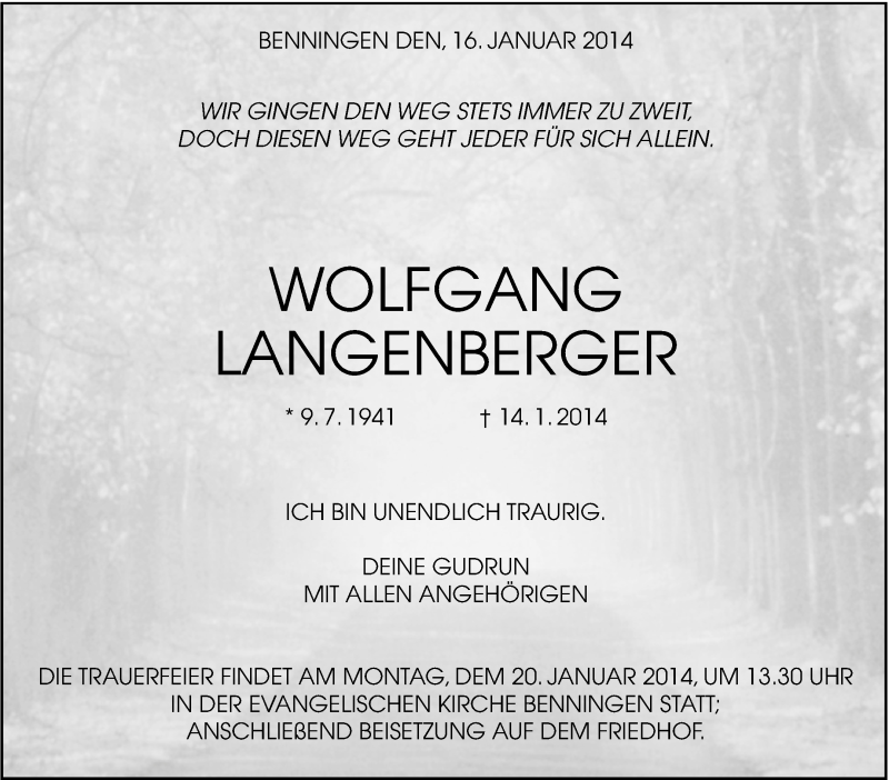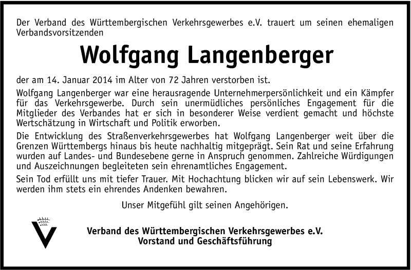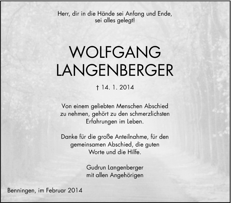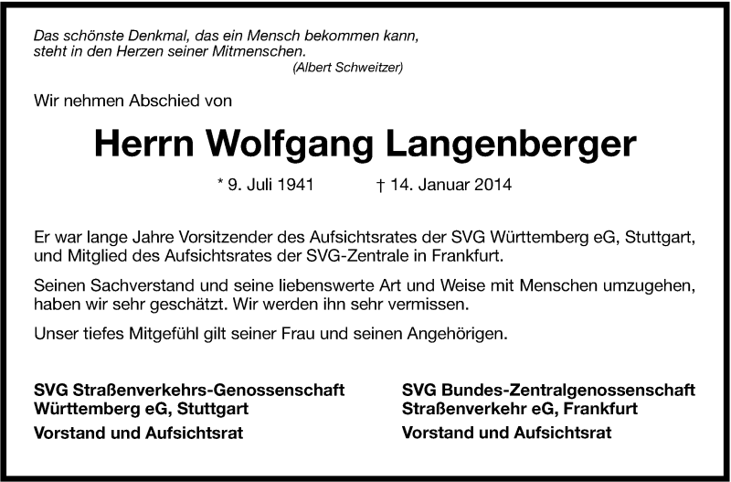 Hier finden Sie alle Traueranzeigen aus der Zeitung, die bisher für Wolfgang Langenberger erschienen sind. Weitere Traueranzeigen, die in der Zeitung erscheinen, werden hier ebenfalls aufgelistet