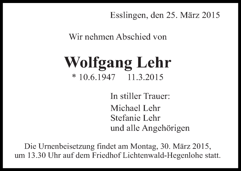 Hier finden Sie alle Traueranzeigen aus der Zeitung, die bisher für Wolfgang Lehr erschienen sind. Weitere Traueranzeigen, die in der Zeitung erscheinen, werden hier ebenfalls aufgelistet