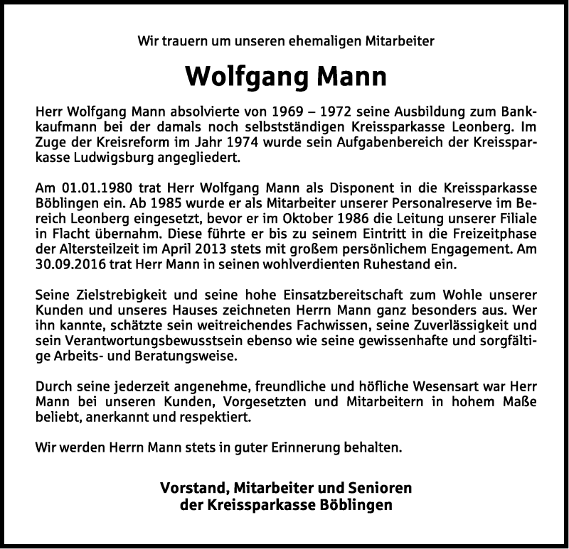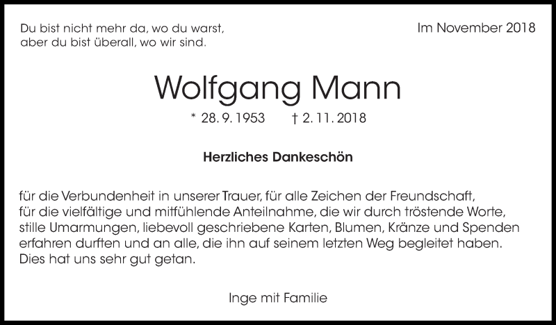 Hier finden Sie alle Traueranzeigen aus der Zeitung, die bisher für Wolfgang Mann erschienen sind. Weitere Traueranzeigen, die in der Zeitung erscheinen, werden hier ebenfalls aufgelistet