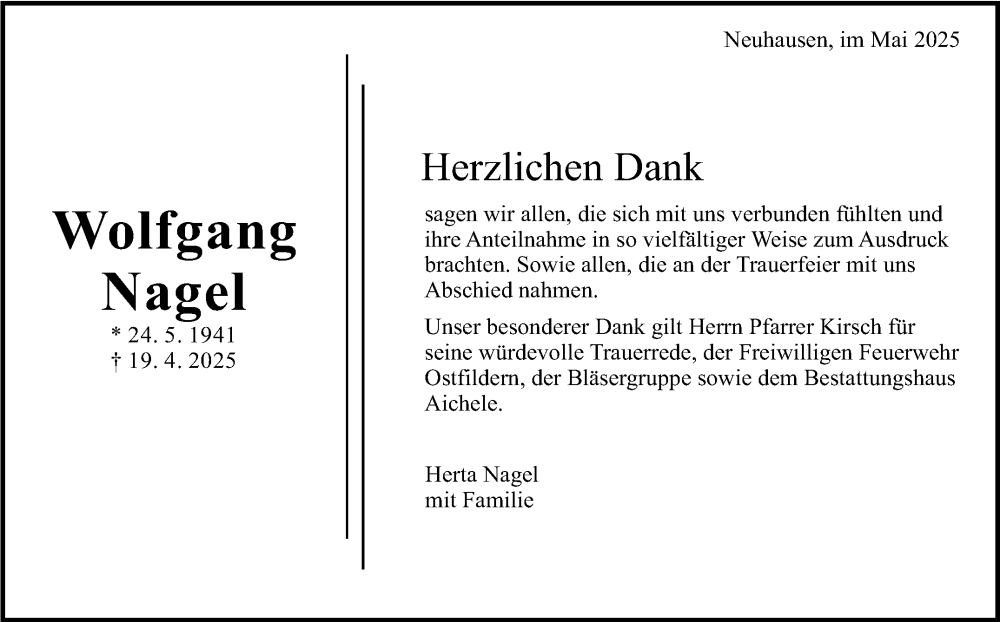 Hier finden Sie alle Traueranzeigen aus der Zeitung, die bisher für Wolfgang Nagel erschienen sind. Weitere Traueranzeigen, die in der Zeitung erscheinen, werden hier ebenfalls aufgelistet