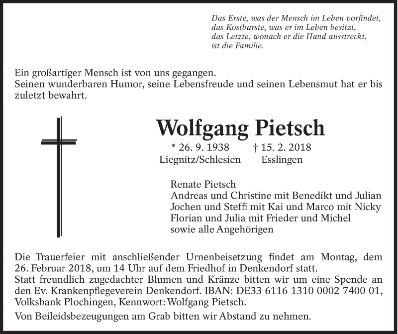 Hier finden Sie alle Traueranzeigen aus der Zeitung, die bisher für Wolfgang Pietsch erschienen sind. Weitere Traueranzeigen, die in der Zeitung erscheinen, werden hier ebenfalls aufgelistet