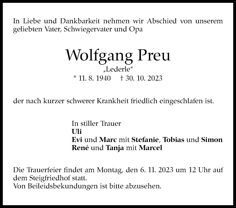 Hier finden Sie alle Traueranzeigen aus der Zeitung, die bisher für Wolfgang Preu erschienen sind. Weitere Traueranzeigen, die in der Zeitung erscheinen, werden hier ebenfalls aufgelistet