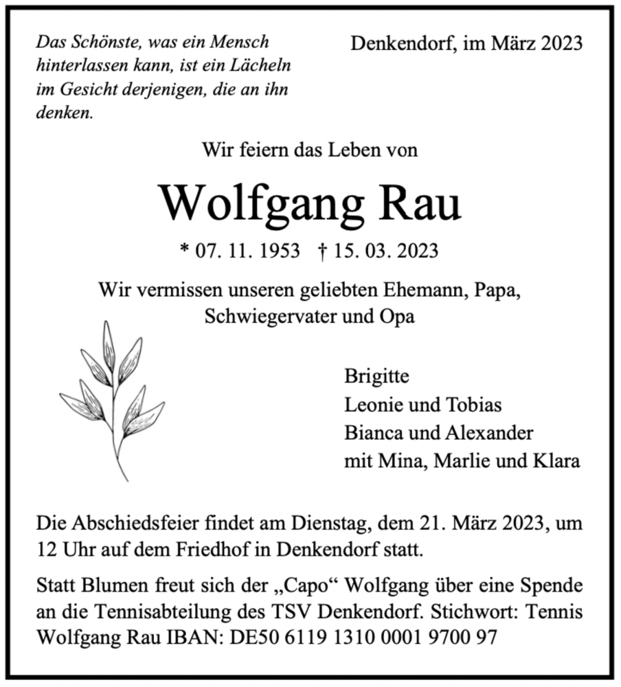 Hier finden Sie alle Traueranzeigen aus der Zeitung, die bisher für Wolfgang Rau erschienen sind. Weitere Traueranzeigen, die in der Zeitung erscheinen, werden hier ebenfalls aufgelistet