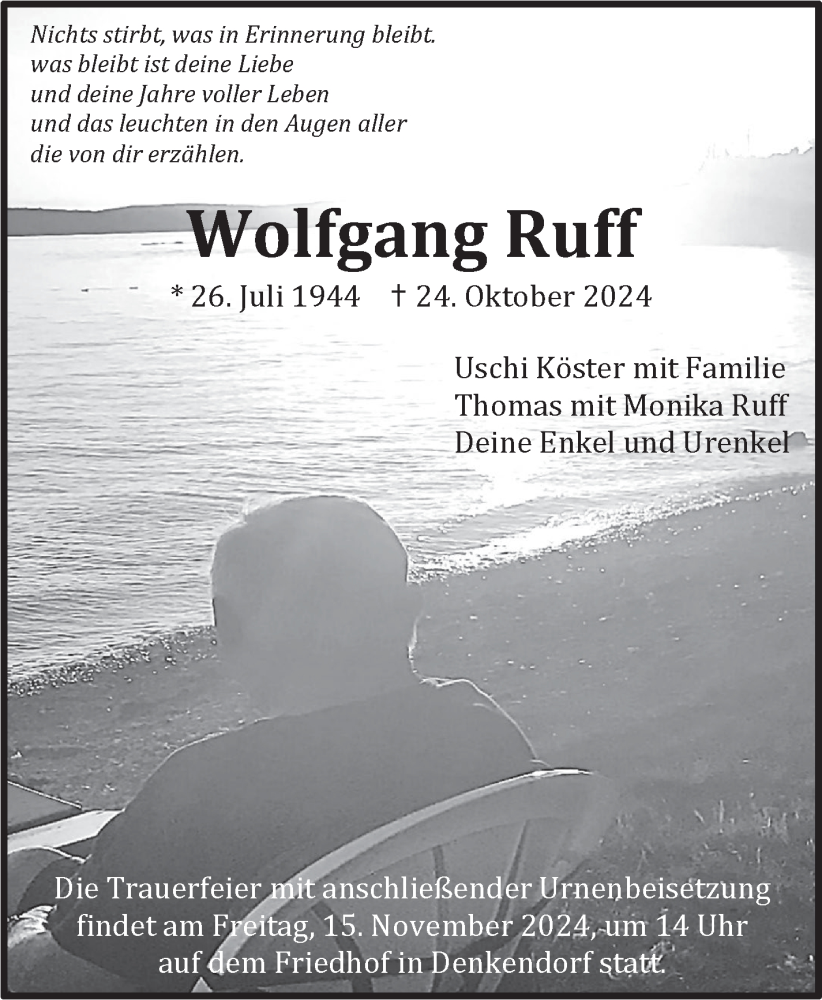 Hier finden Sie alle Traueranzeigen aus der Zeitung, die bisher für Wolfgang Ruff erschienen sind. Weitere Traueranzeigen, die in der Zeitung erscheinen, werden hier ebenfalls aufgelistet
