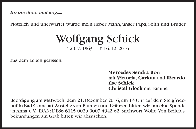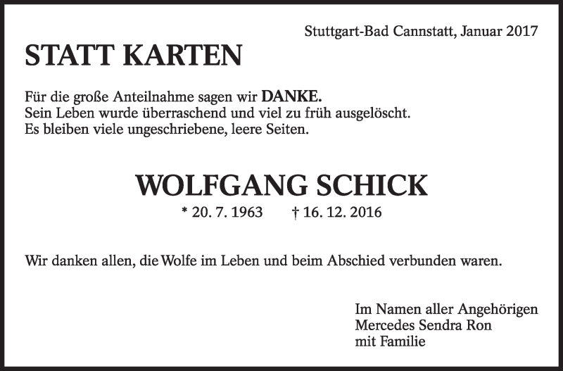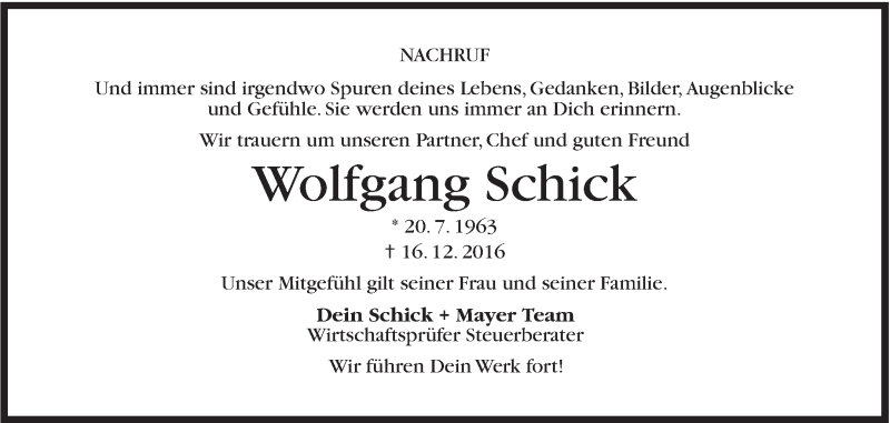 Hier finden Sie alle Traueranzeigen aus der Zeitung, die bisher für Wolfgang Schick erschienen sind. Weitere Traueranzeigen, die in der Zeitung erscheinen, werden hier ebenfalls aufgelistet