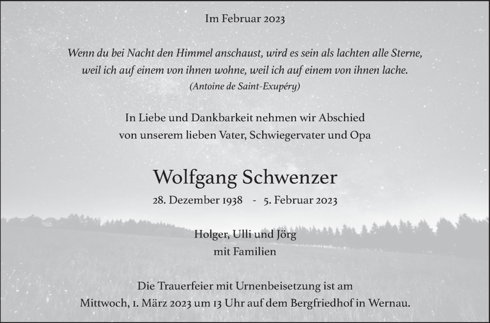 Hier finden Sie alle Traueranzeigen aus der Zeitung, die bisher für Wolfgang Schwenzer erschienen sind. Weitere Traueranzeigen, die in der Zeitung erscheinen, werden hier ebenfalls aufgelistet