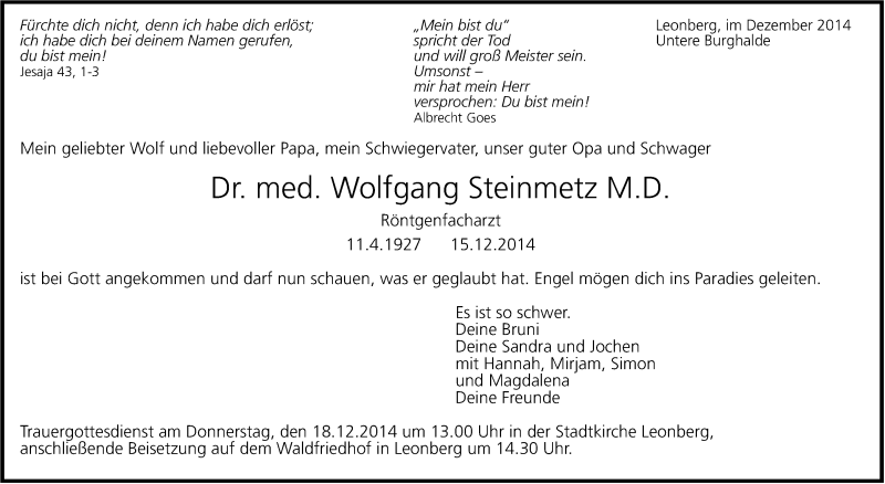 Hier finden Sie alle Traueranzeigen aus der Zeitung, die bisher für Wolfgang Steinmetz erschienen sind. Weitere Traueranzeigen, die in der Zeitung erscheinen, werden hier ebenfalls aufgelistet