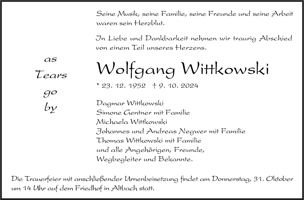 Hier finden Sie alle Traueranzeigen aus der Zeitung, die bisher für Wolfgang Wittkowski erschienen sind. Weitere Traueranzeigen, die in der Zeitung erscheinen, werden hier ebenfalls aufgelistet