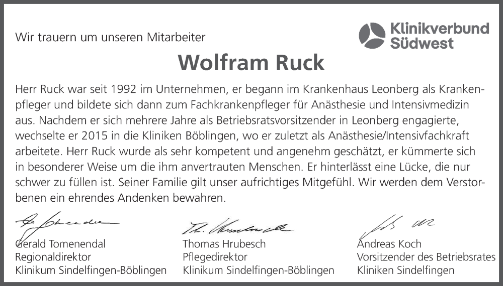 Hier finden Sie alle Traueranzeigen aus der Zeitung, die bisher für Wolfram Ruck erschienen sind. Weitere Traueranzeigen, die in der Zeitung erscheinen, werden hier ebenfalls aufgelistet