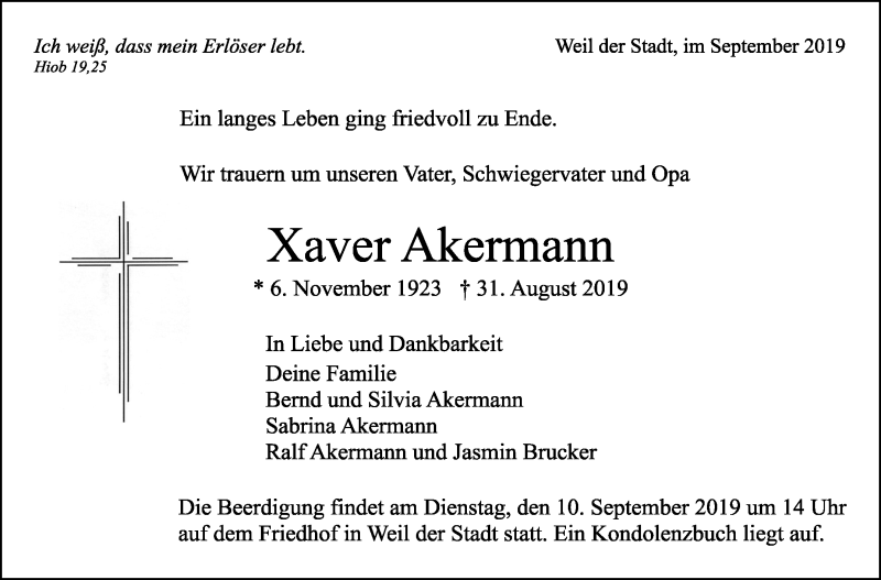 Hier finden Sie alle Traueranzeigen aus der Zeitung, die bisher für Xaver Akermann erschienen sind. Weitere Traueranzeigen, die in der Zeitung erscheinen, werden hier ebenfalls aufgelistet