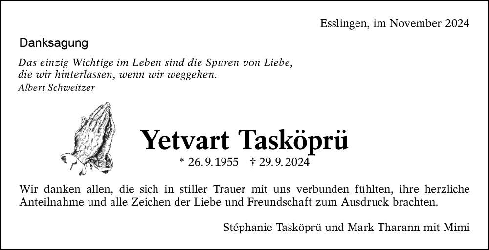 Hier finden Sie alle Traueranzeigen aus der Zeitung, die bisher für Yetvart Tasköprü erschienen sind. Weitere Traueranzeigen, die in der Zeitung erscheinen, werden hier ebenfalls aufgelistet