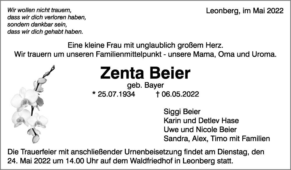 Hier finden Sie alle Traueranzeigen aus der Zeitung, die bisher für Zenta Beier erschienen sind. Weitere Traueranzeigen, die in der Zeitung erscheinen, werden hier ebenfalls aufgelistet